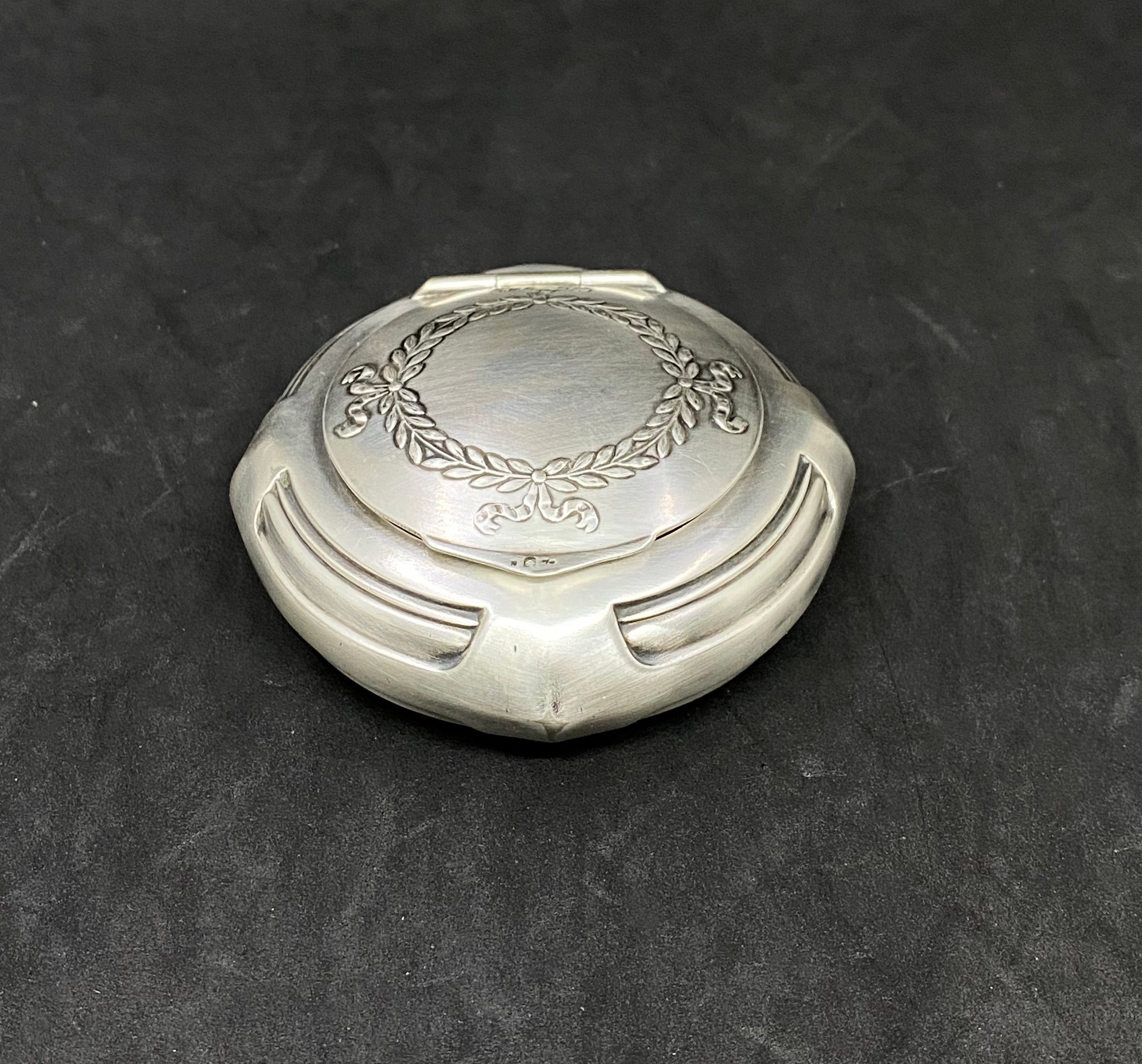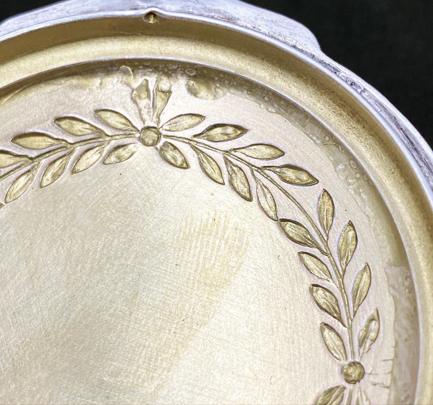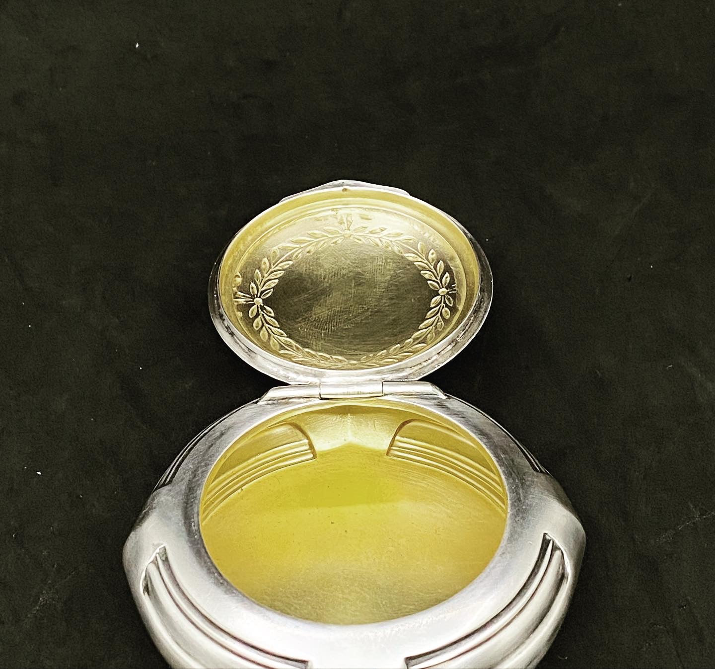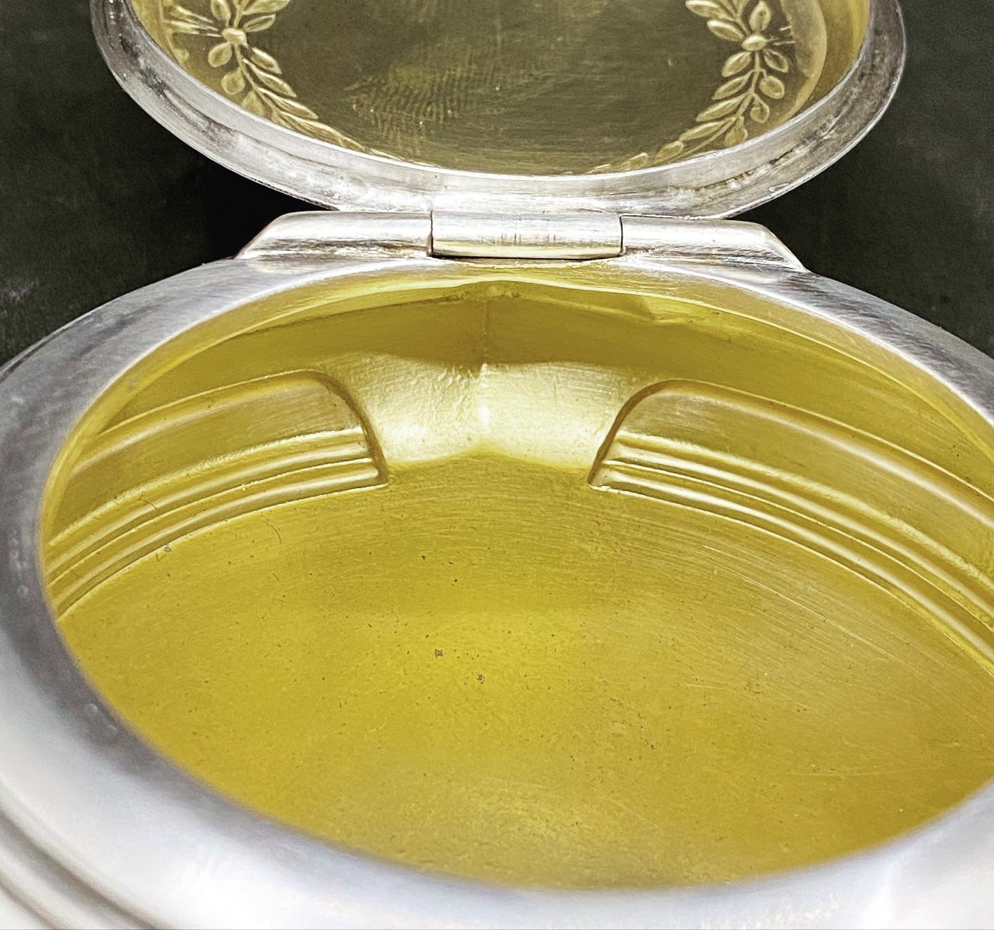 Made of pewter and silver plated, with the inner lining of silk origin, small jewelry box of the reputable brand WMF. With foliate decoration. Original silk lining with some signs of the passage of time but in very good condition considering the age of the object.