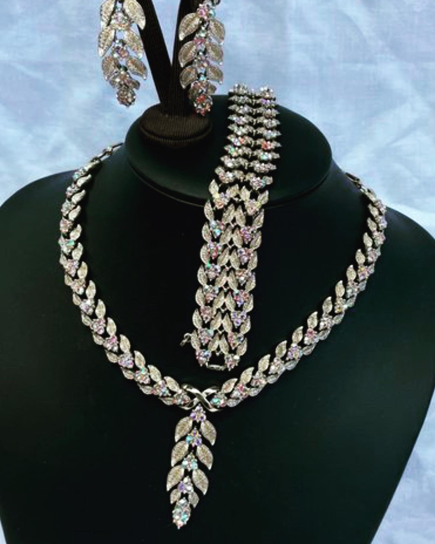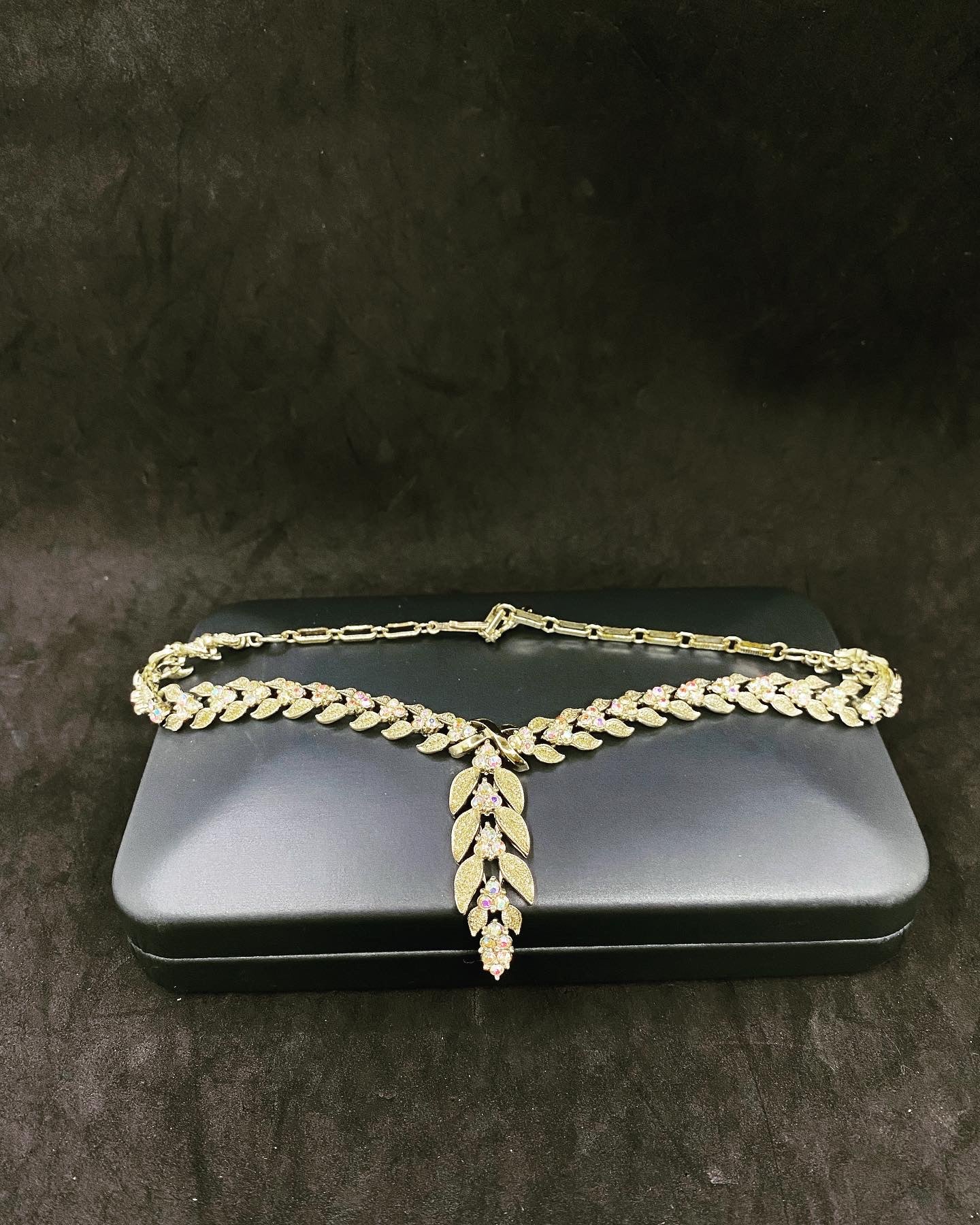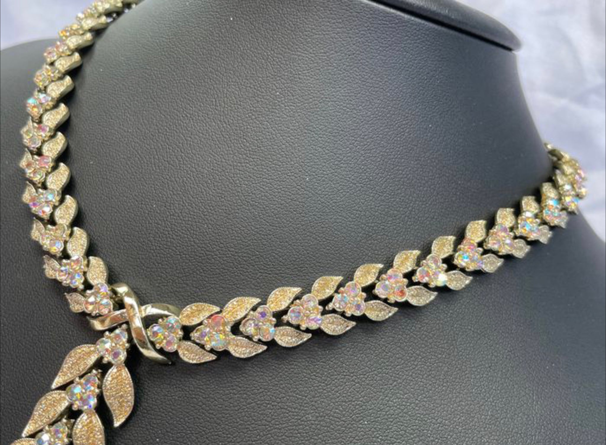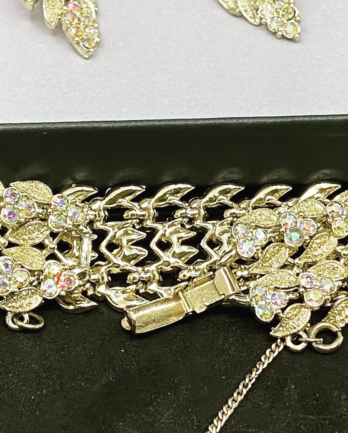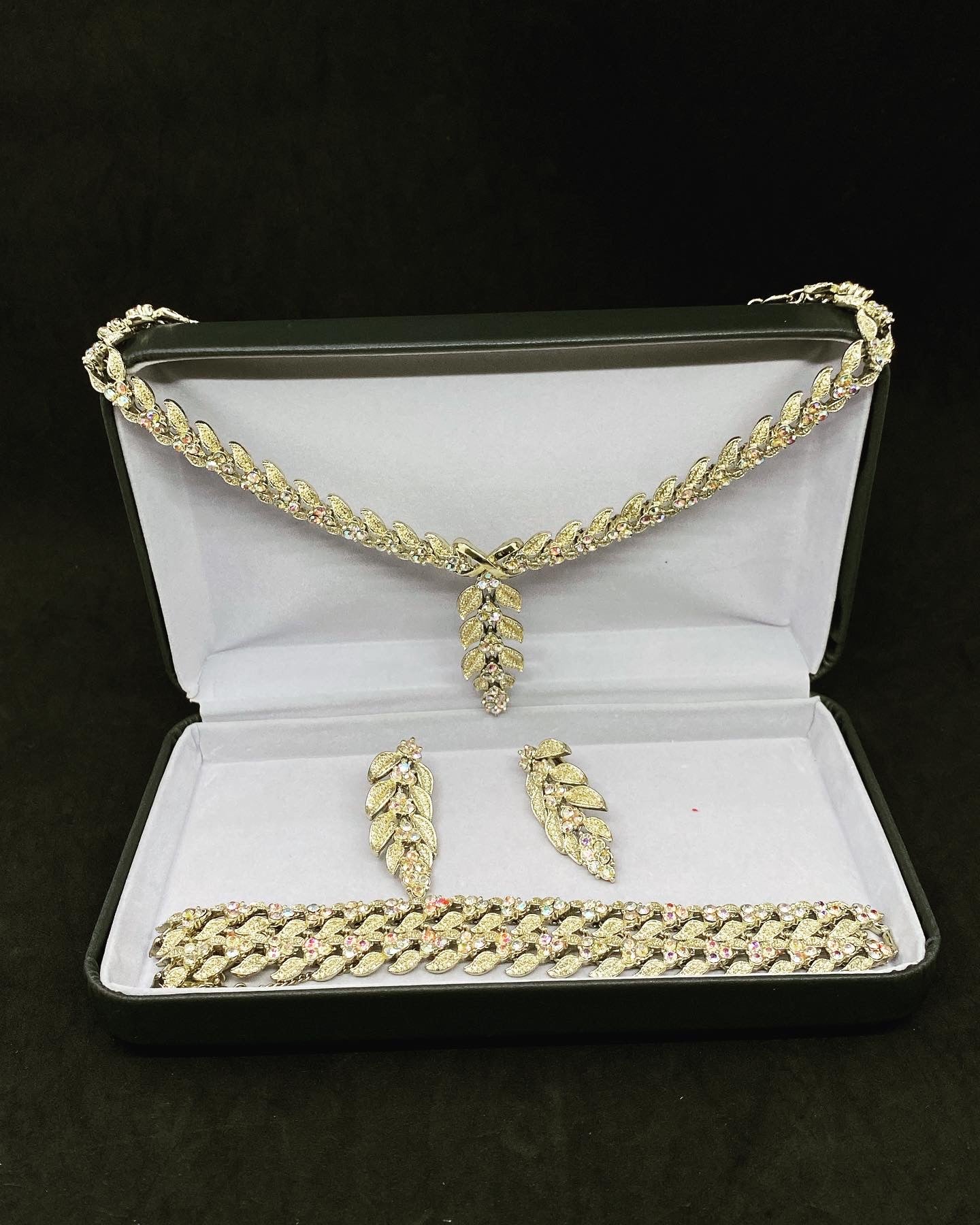 Coro rare set made for the Jewelcraft range rich gold plated with raised textured design and leaf pattern encrusted with bright brilliant cut Ab crystal gems unusual necklac with drop tassel front aprox 43cm long 6cm drop to front extender chain and j hook with Coro lovely bracele aprox 19cm long 2.5cm wide fold over signed locking clasp runway drop statement earrings aprox 5.5cm drop clip and screw style signed