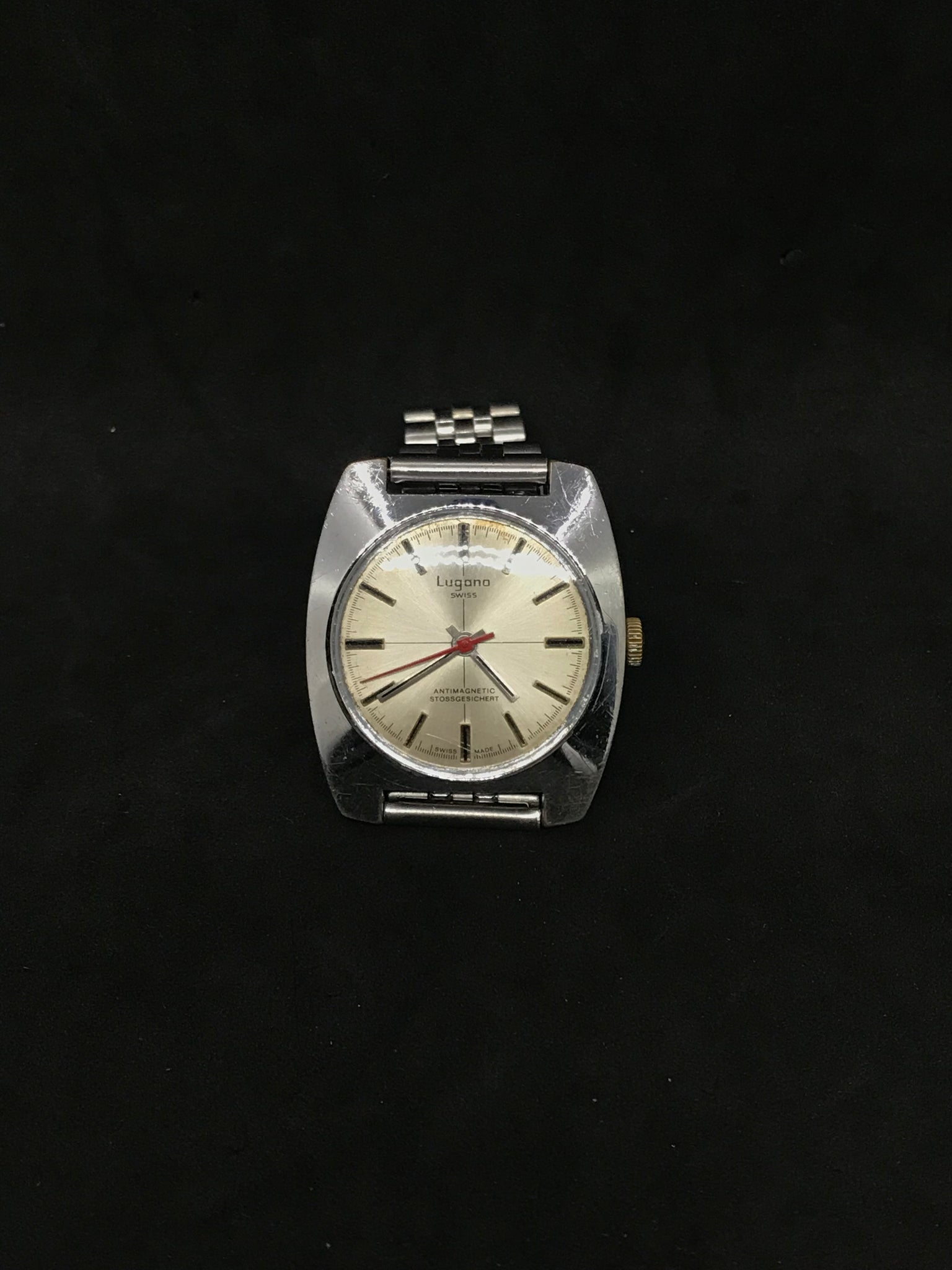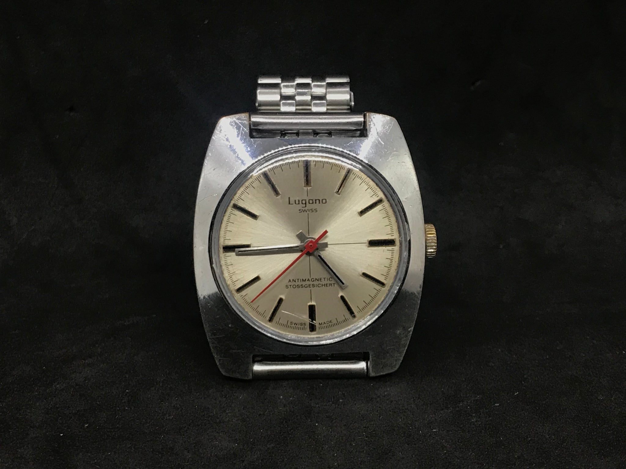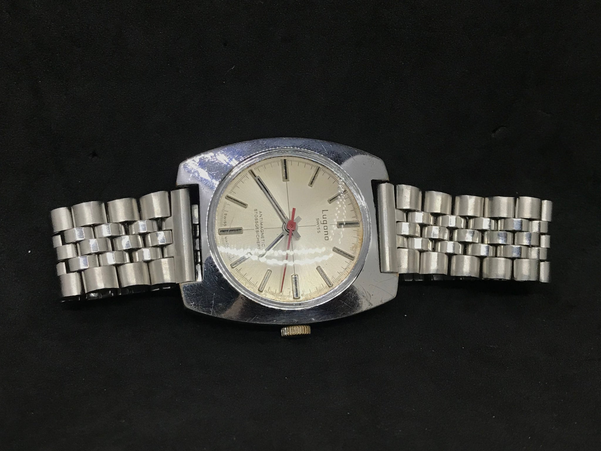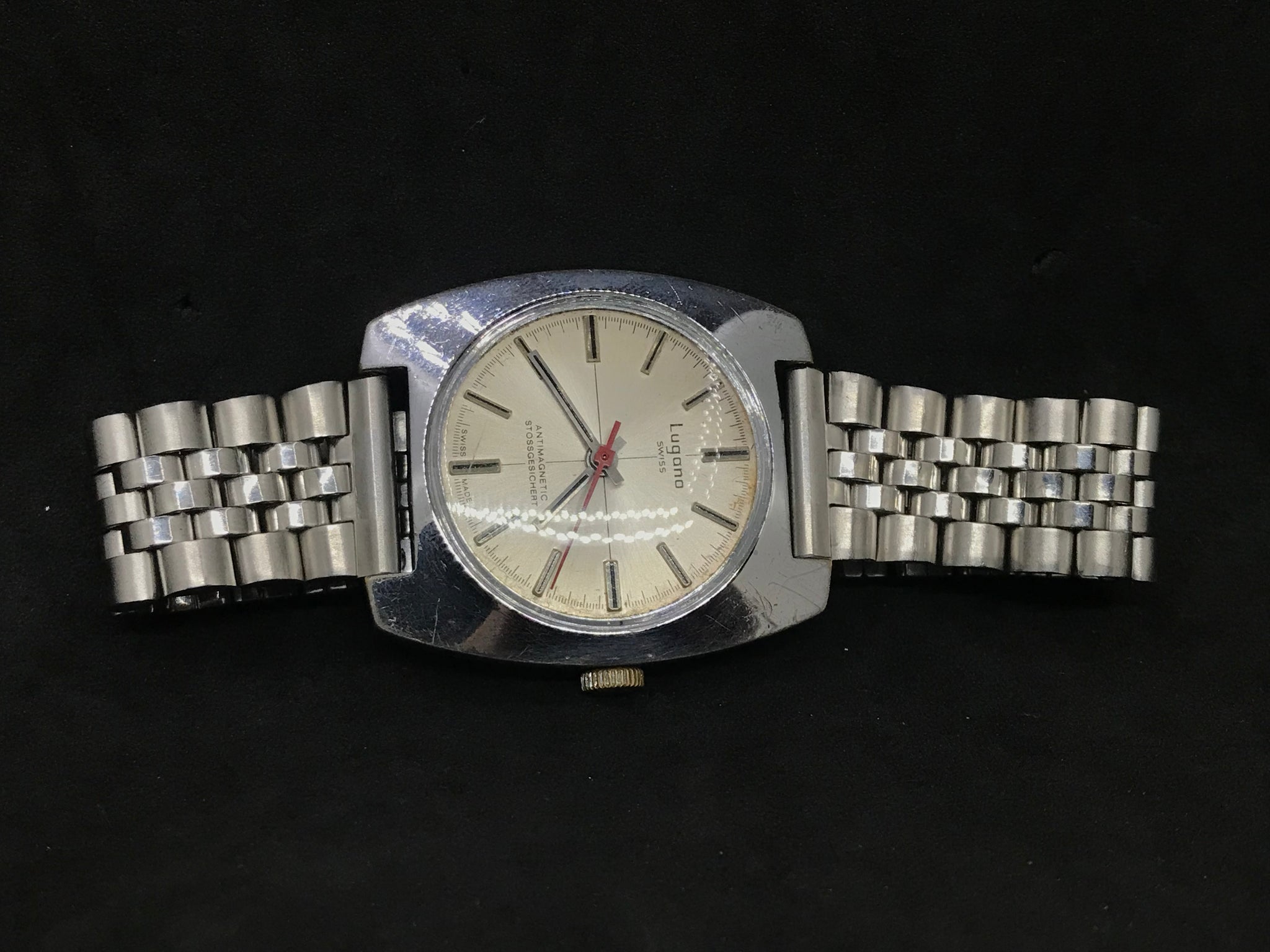 LUGANO SWISS MADE CROSSHAIR HAND WINDING VINTAGE RED-POINTER GENT WATCH + JUBILÉ STRAP